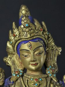 Very detailed Nepal/Tibet 19th century Rich bejuweled Tara Fire gilded (Ormolu) copper goldface statue.